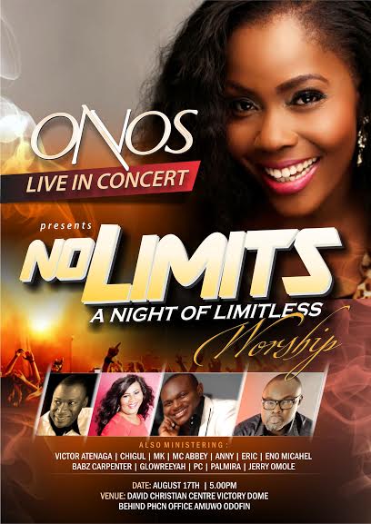 Award winning gospel sensation ONOS is set to release her sophomore album NO LIMITS (featuring hit songs like Everything Has Changed, ALAGBARA, You Are The Reason, Victory Song) at the ‘ No Limit’ concert, August 17th 2014 at the David Christian Centre Victory Dome (beside PHCN office Amuwo odofin)..