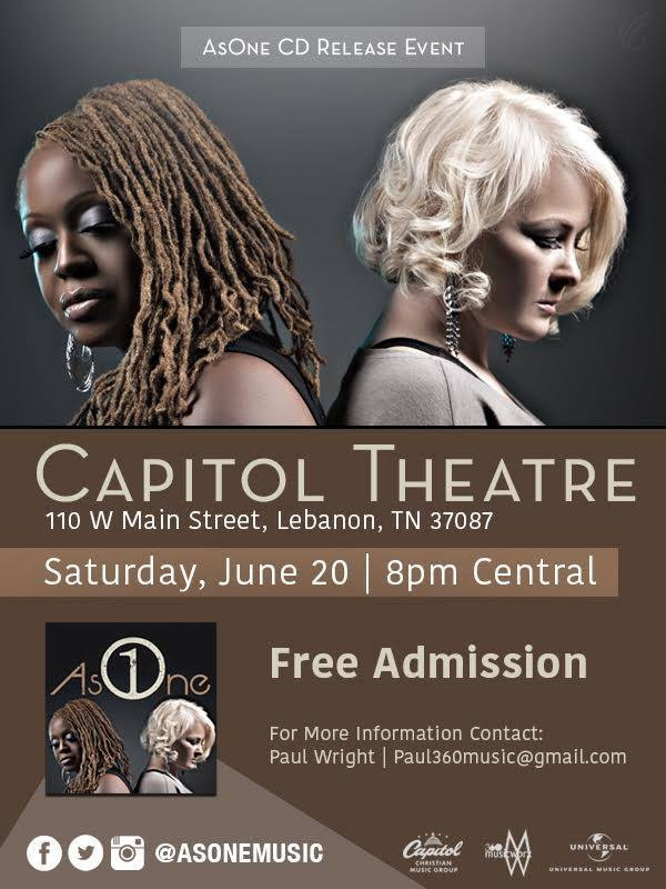 AsOne’s album release event will take place this Saturday, June 20th at the Capitol Theatre located at 110 West Main Street in Lebanon, Tennessee (near Nashville). The event starts at 8pm and is FREE to the public.