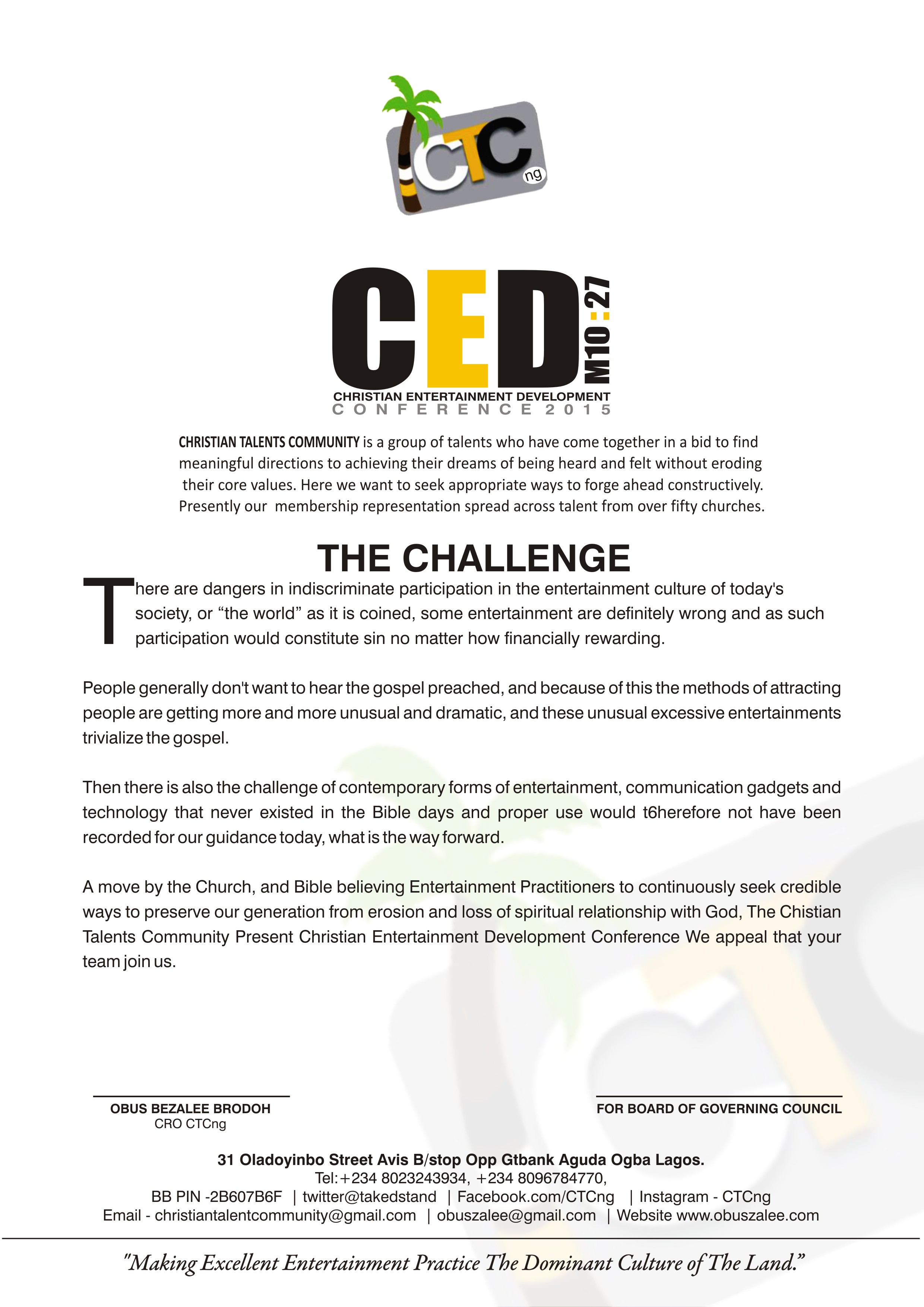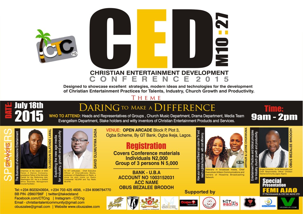 Christian Entertainment Development (CED) Conference is a project organized by the Christian Talents Community,  Headed by a veteran of Christian Comedian; Obus Zalee.