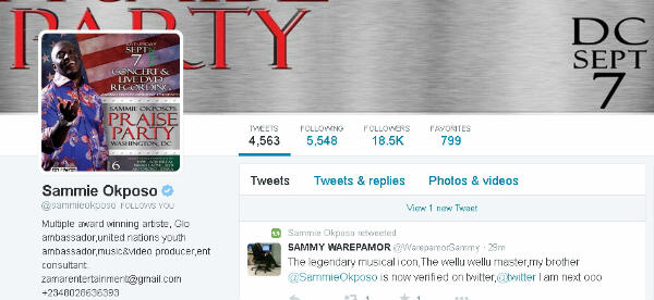 Gospel singer and Glo Ambassador Sammie Okposo has been verified on Twitter (blue circle beside his name), joining the very few Nigerian gospel artistes whose accounts have been verified on the social networking platform. Others are Chocolate City‘s Nosa, London based Gospel artistes, Isabella and Muyiwa Olarewaju..