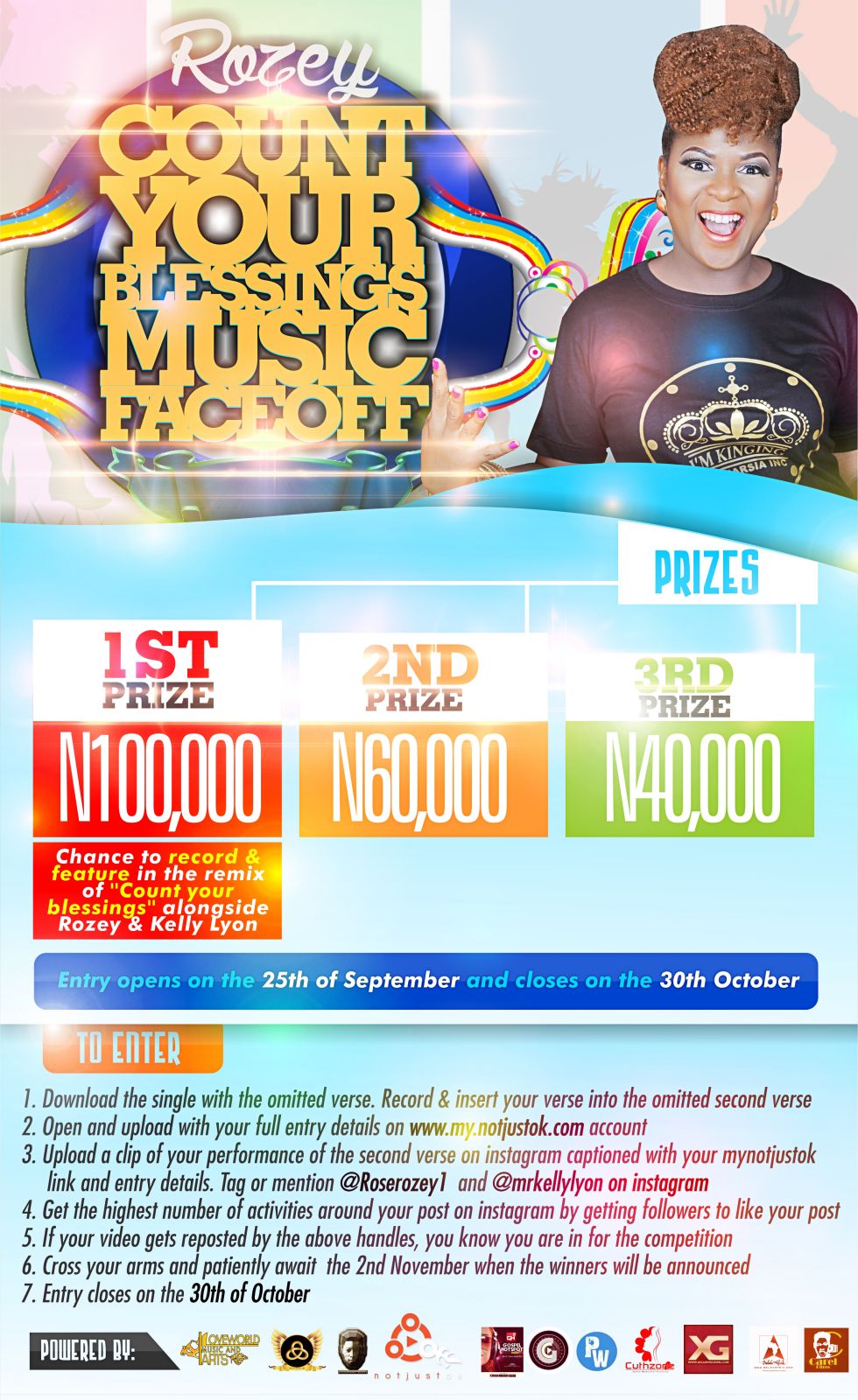 - Upload a clip of your performance of the 2nd verse on Instagram captioned with your mynotjustok link and entry details.